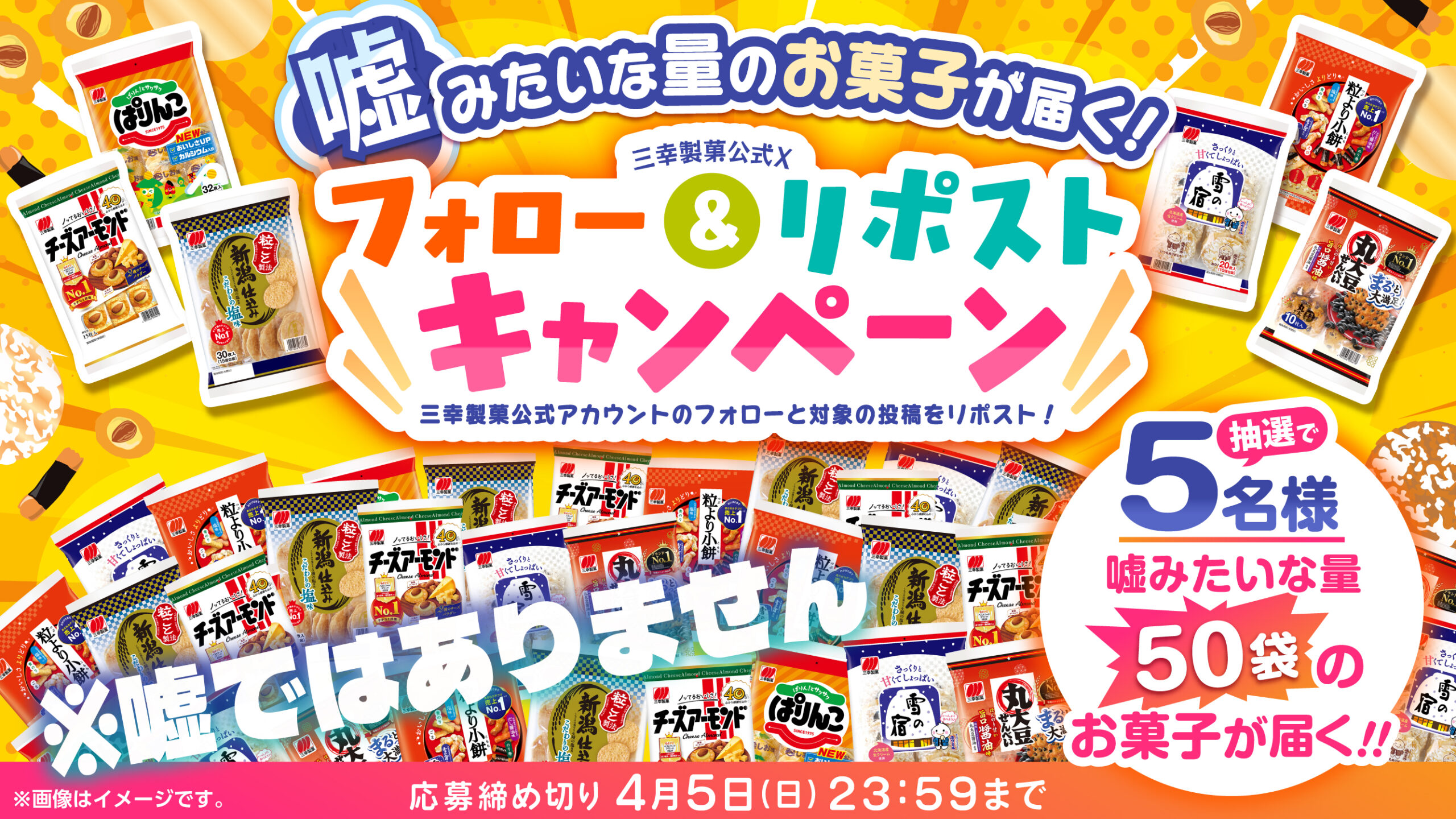 嘘みたいな量のお菓子が届く!三幸製菓公式Xフォロー&リポストキャンペーン